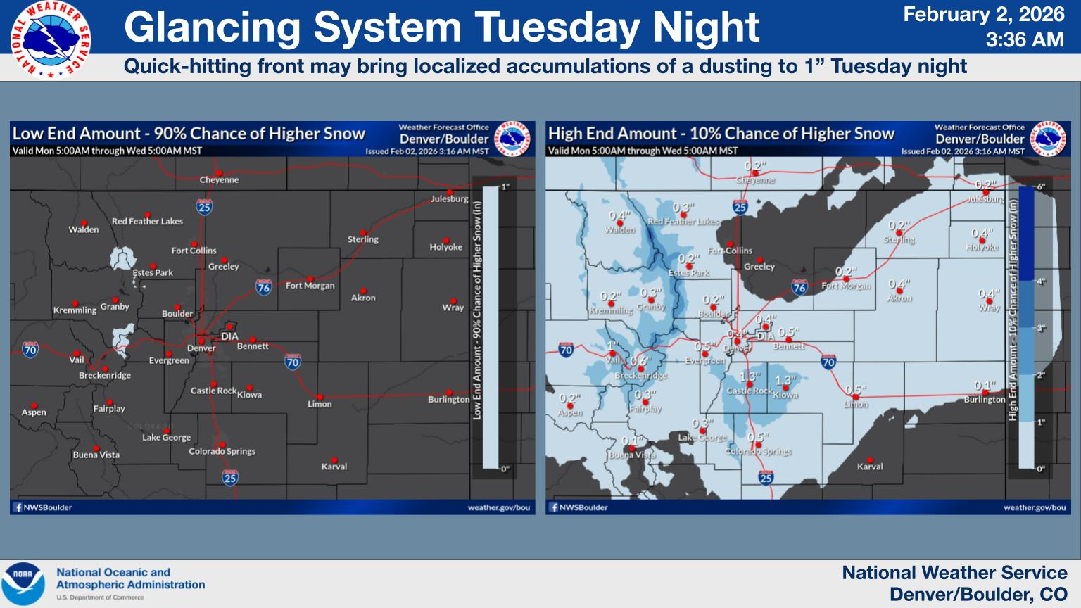 NWS Boulder / Denver Forecast Office Weather Story: No advisory issued today. Snow in the forecast for Tuesday.