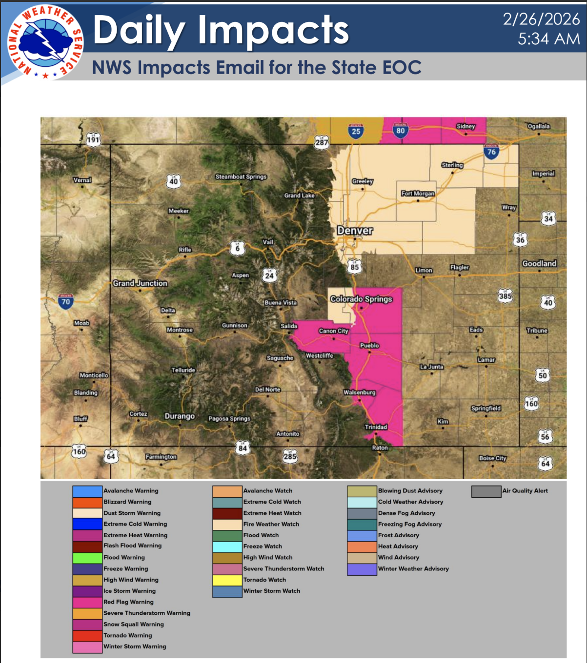 The National Weather Service has issued Red Flag Warning from Colorado Springs to our southern border and Fire Weather Watch from along the northern front range from Denver to our north border and extending into the eastern plains.