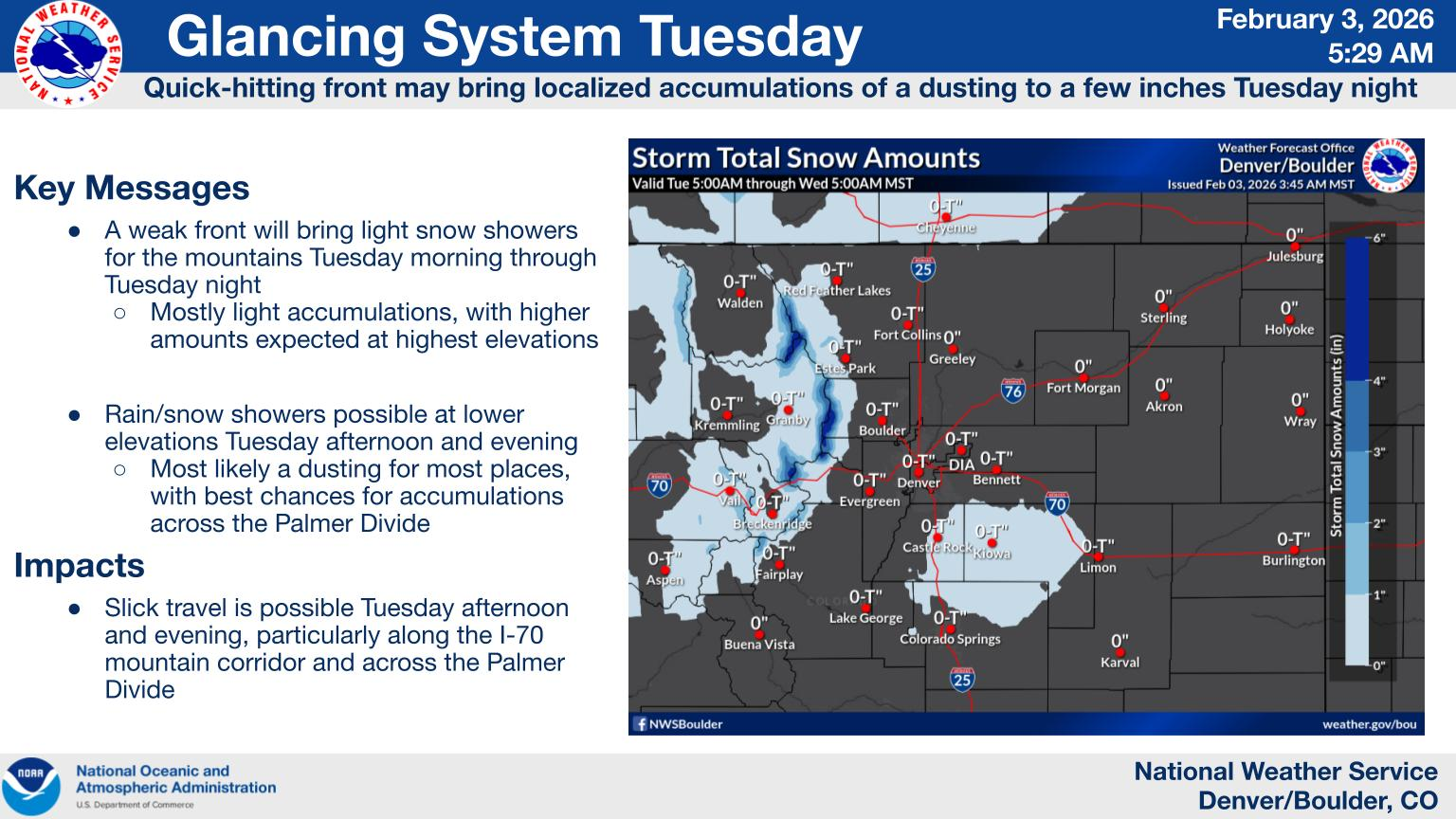 NWS Boulder / Denver Forecast Office Weather Story: No advisory issued today. Snow in the forecast for Tuesday.